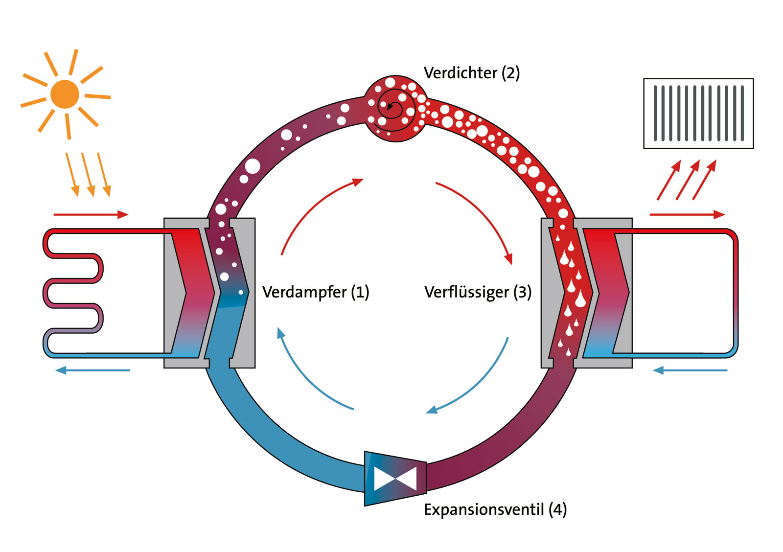 Das Prinzip der Energiegewinnung mit einer Wärmepumpe lässt sich in etwa mit einem Kühlschranks vergleichen, jedoch mit anderer Zielsetzung - sie soll nicht kühlen, sondern heizen. Dazu wird ein thermodynamischer Prozess genutzt: In einem Rohrsystem zirkuliert ein Arbeitsmittel mit sehr niedrigem Siedepunkt, das durch die Umweltwärme verdampft. Die über den Verdampfer gewonnene Umweltwärme wird auf das Arbeitsmittel übertragen und dem Verdichter zugeführt. Dieser bringt es mithilfe von elektrischer Energie auf ein höheres Temperaturniveau, welches für das Heizsystem nutzbar ist. Über einen zweiten Wärmetauscher, den Kondensator, wird diese Wärme an das Heizsystem übergeben. Das gasförmige Arbeitsmittel kondensiert wieder in den flüssigen Zustand zurück und der Kreislauf beginnt von vorne. Das funktioniert sogar bei niedrigen Außentemperaturen. So werden bei einer Leistungszahl von bis zu 3,7 mit nur 30% Antriebsenergie 100% Heizenergie erzeugt.